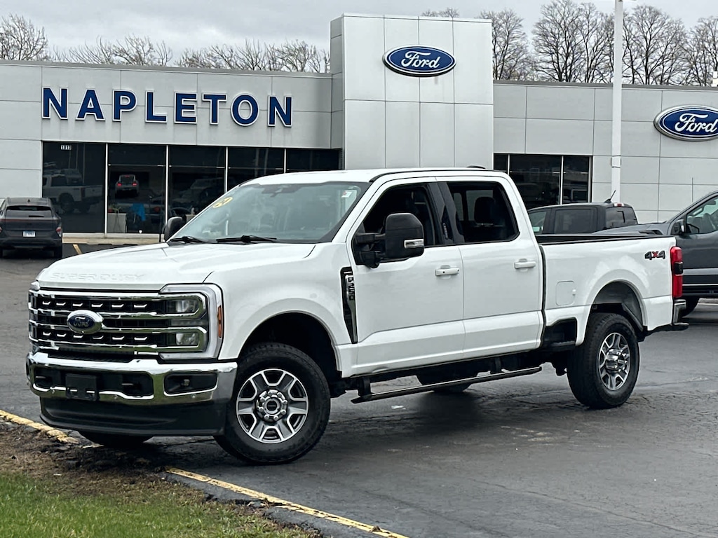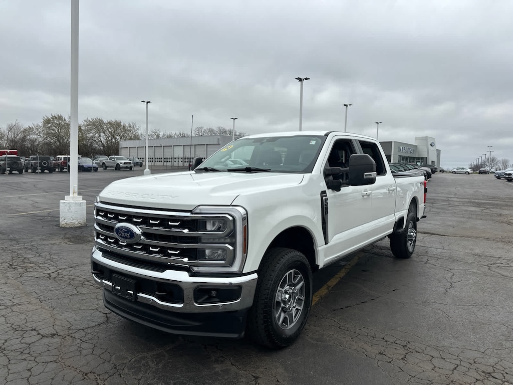 LARIAT ULTIMATE PACKAGE Wireless Charging Pad, Front Sensing System, Tailgate Step & Handle, Intelligent Adaptive Cruise Control w/Stop-and-Go, lane centering and speed sign recognition, Radio: B&O Unleashed Sound System by Bang & Olufsen, HD Radio w/14 speakers including subwoofer, Pro Trailer Hitch Assist, Ford Co-Pilot 360 2.0, rear view camera, reverse brake assist and reverse sensing system, Lane-Keeping System, lane-keeping alert, lane-keeping aid and driver alert, Pre-Collision Assist, Automatic Emergency Braking (AEB), pedestrian detection, forward collision warning, dynamic brake support and intersection assist, Post-Collision Braking, Automatic High Beam, BLIS w/Cross-Traffic Alert, trailer coverage, Upfitter Switches (6), Located in overhead console, 4-Way Adjustable Headrests, STAR WHITE METALLIC TRI-COAT, 5TH WHEEL/GOOSENECK HITCH PREP PACKAGE: 5 pickup bed attachment points w/plugs, 1 frame under-bed cross member and 1 integrated 7-pin connector on drivers side pickup bed wall, 5th wheel hitch compatibility: the 5th Wheel/Gooseneck Prep Package (53W) is compatible w/the factory orderable 5th Wheel Hitch Kits (15K and 15L) and dealer-installed Ford accessories 5th Wheel Hitch Kit by Reese - part #BC3Z-19D520-A (8ft box only), The prep package is also compatible w/Reese Signature Series 5th wheel hitch kits updated w/a new Leg Service Kit - part #BC3Z-A00A25-A (8ft box only), The 5th Wheel Hitch Kit (15K), 5th Wheel Hitch Kit (15L) and dealer-installed Ford accessories 5th Wheel Hitch Kit by Reese - part #BC3Z-19D520-A is not released to the short box (6.75ft box), Note: the short pickup, ELECTRONIC-LOCKING W/3.73 AXLE RATIO, TRANSMISSION: TORQSHIFT 10-SPEED AUTOMATIC SelectShift and selectable drive modes: normal, eco, slippery roads, tow/haul and off-road (STD), ENGINE: 7.3L 2V DEVCT NA PFI V8 GAS (STD).