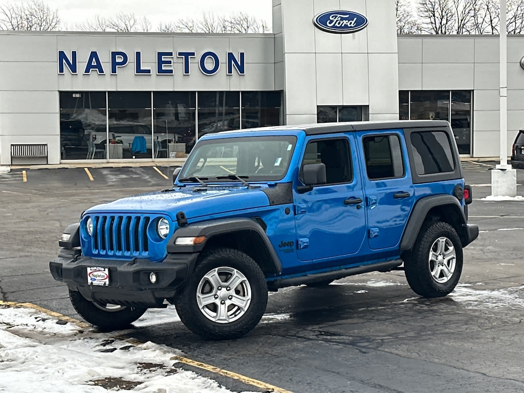CarFax Certified , 4x4, Locally Owned, Excellent Condition, Fully Inspected by our Napleton Technicians, Polished Aluminum Wheels, Auto Check One Owner! Excellent Condition. EPA 24 MPG Hwy/19 MPG City! Unlimited Sport S trim, Hydro Blue Pearlcoat exterior and Black interior. Heated Seats, Keyless Start, Bluetooth®, iPod/MP3 Input, Back-Up Camera, Aluminum Wheels, TRANSMISSION: 8-SPEED AUTOMATIC (850R. ENGINE: 3.6L V6 24V VVT ETORQUE UPG I. COLD WEATHER GROUP, CONVENIENCE GROUP, TECHNOLOGY GROUP, QUICK ORDER PACKAGE 25S SPORT S, BLACK 3-PIECE HARD TOP.